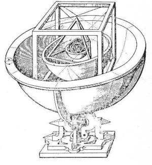равнив количества правильных многогранников и количество межорбитных пространств ответ казалось, был найден, осталось только решить вопрос об относительных расстояниях между орбитами планет: в сферу, на которой расположена орбита Сатурна, вписан куб, в него вписана следующая сфера Марса, додекаэдр, сфера Земли, икосаэдр, сфера Венеры, октаэдр, сфера Меркурия, в центре всей системы Солнце.