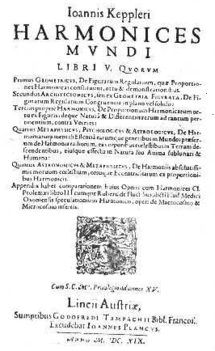 В 1599 г. Кеплер начинает работать над книгой, которую он задумал давно. Это научное произведение о мировой гармонии, он назовет “Harmonices Mundi Libri V” «Пять книг гармонии Мира» (или «Мировая гармония»). Эта работа была напечатана в1619 г. и включала пять отдельных книг, которые назывались: