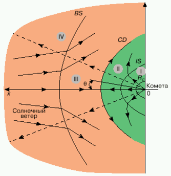Если бы подтверждалась гипотеза о сверхзвуковом истечении кометного газа с поверхности ядра, то должна образоваться также ударная волна IS в потоке кометных ионов. До этой ударной волны (в области I на рис. 4) сверхзвуковой поток кометного газа не чувствует присутствия солнечного ветра (наличие границы CD чувствует только дозвуковая область II на рис. 4). Количественные оценки реальных расстояний до поверхностей BS, CD и IS в сильной степени зависят от параметра G, характеризующего количество молекул, покидающих кометное ядро в единицу времени. Этот параметр определяется формулой