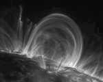 зобретение фотографии дало астрономам объективный и документальный метод исследования. Однако получить хороший снимок короны тоже нелегко. Дело в том, что ближайшая к Солнцу её часть, так называется внутренняя корона, сравнительно яркая в то время как далеко протирающаяся внешняя корона представляется очень бледным сиянием. Поэтому если на фотографиях хорошо видна внешняя корона, то внутренняя оказывается передержанной, а на снимках, где просматриваются детали внутренней короны, внешняя совершенно незаметна. Чтобы преодолеть эту трудность, во время затмения обычно стараются получить сразу несколько снимков короны – с большими и маленькими выдержками. Или же корону фотографируют, помещая перед фотопластиной специальный “радиальный” фильтр, ослабляющий кольцевые зоны ярких внутренних частей короны. На таких снимках её структуру можно проследить до расстояний во много солнечных радиусов. При наблюдении с поверхности Земли Солнечная корона, простирающаяся над видимой поверхностью Солнца - фотосферой - выглядит как с трудом различимое разреженное бледное образование, которое, однако, согласно измерениям в сотни раз горячее самой фотосферы. В чем источник ее нагрева? Астрономы с давних пор считали причиной высокой температуры короны магнитные поля, которые поднимают чудовищных размеров петли солнечной плазмы над фотосферой. Однако новые невероятно подробные наблюдения корональных петель, сделанные на спутнике TRACE, указывают на иной источник энергии неизвестной природы. Этот и другие снимки, сделенные на спутнике TRACE в диапазоне вакуумного ультрафиолета, свидетельствуют о том, что процесс нагрева происходит в нижней части короны вблизи основания петель там, где они соединяются с поверхностью Солнца. Новые результаты опровергают общепринятую теорию, предполагающей равномерный нагрев петель. На этом фантастическом изображении со спутника TRACE видны пучки величественных горячих корональных петель своими размерами в 30 и более раз превышающих диаметр Земли.