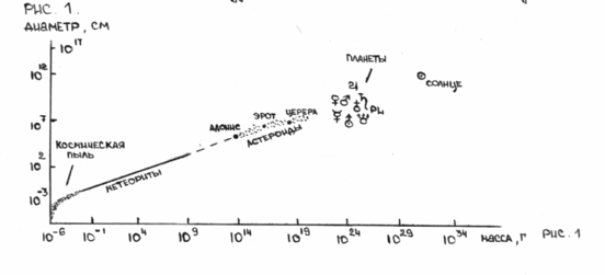 В Солнечной системе наблюдается огромный диапазон масс, особенное если учесть наличие в межпланетном пространстве космической пыли. Различие в массах между солнцем и какой-нибудь пылинкой в тысячную долю миллиграмма будет составлять около 40 порядков (иначе говоря, отношение их масс будет выражаться числом с 40 нулями.).