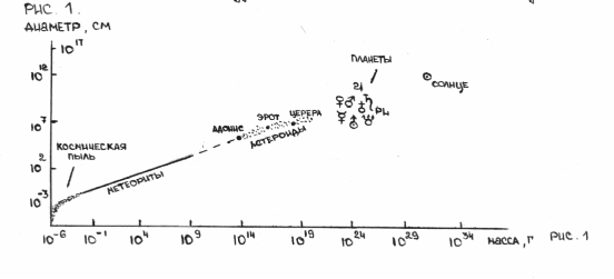 В Солнечной системе наблюдается огромный диапазон масс, особенное если учесть наличие в межпланетном пространстве космической пыли. Различие в массах между солнцем и какой-нибудь пылинкой в тысячную долю миллиграмма будет составлять около 40 порядков (иначе говоря, отношение их масс будет выражаться числом с 40 нулями.).