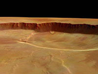 Спутник Mars Express передал новые снимки Марса. Снимок слева - вид сверху на кальдеру (т.е. кратер на вершине) марсианской горы Олимп, самого высокого вулкана в Солнечной системе. Средняя высота вулкана 22 километра, а кальдера имеет глубину около трех. Снимок был сделан на высоте 37 километров с помощью стереокамеры высокого разрешения (HRSC).