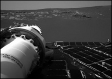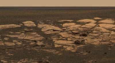 Новый цветной 360-градусный панорамный снимок, полученный от Opportunity, демонстрирует следы прыжков марсохода на своих воздушных мешках, совершенных им после приземления на внутреннем откосе кратера. Это мозаичное изображение было составлено из 250 отдельных снимков. Так же на нем видны области обнаженной горной породы. Именно этот район в скором времени исследует Opportunity.