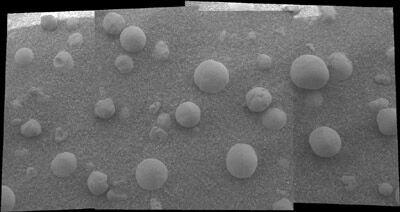 Марсоход Opportunity проанализировал первый образец марсианской почвы в районе своей посадки и обнаружил в смеси мелких различных частиц странные сферические камешки. Они были обнаружены на новых снимках микроскопа, последней из 20 камер марсохода. Все о