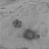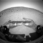 ем временем, двойник марсохода Spirit, Opportunity, закончил исследование своей ямки и теперь направляется к области "El Capitan" в поисках удобного места для первого применения своего абразионного инструмента. Здесь горные породы выходят на поверхность, позволяя исследовать не только верхние, но и нижние слои грунта. Opportunity впервые применил абразионный инструмент своей руки для сверления отверстия в камне, названном 'McKittrick Middle Rat' в области El Capitan. Сверление продолжалось 2 часа, в результате чего было проделано отверстие глубиной около 4 миллиметров. Отверстие было исследовано с помощью микроскопа и рентгеновского спектрометра. Далее планируется продолжить исследования камня с помощью мессбауэровского спектрометра, а так же еще раз применить абразионный инструмент для сверления новых отверстий в области El Capitan. Марсоход Opportunity передал на Землю первые снимки отверстия проделанного им в камне McKittrick. Ученые были обрадованы тем, что абразионный инструмент марсохода задел и разрезал пополам две сферические частицы, которые были скрыты внутри камня. Эти шарики, названные 'черничками' уже встречались на снимках других ранее исследованных камней. Теперь ученые смогут изучить их внутреннее строение. Два черных прямоугольника на снимке - часть данных, потерянных при передаче на Землю. При следующей связи планируется переслать поврежденные снимки.