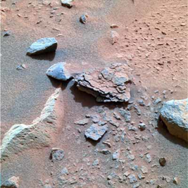 На новом цветном изображении, полученном от марсохода Spirit, виден необычный слоистый камень, названный Mimi(слева). Этот камень не похож ни на один из ранее исследованных в кратере Гусева. Слоистая структура этого камня приводит ученых к нескольким гипотезам о его происхождении. Возможно, этот странный камень образовался в результате мощного удара, а может быть, был когда-то небольшой горкой песка зацементированной в "чешуйчатые" слои, что обычно происходит в присутствии воды. Теперь учёные намерены проанализировать полученные данные, чтобы выяснить структуру и происхождение этого камня. Так же марсоход нашел еще один странный камень (названный 'White Boat', 'Белая лодка'), выделяющийся на фоне остальных более светлым цветом и ровной формой (справа). Он будет так же изучен.