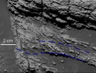 В рисунке слоев некоторых слоистых скал обнаруживаются песчинки осадочной породы, которые со временем склеились вместе и были выстроены в форме ряби водным потоком глубиной, по меньшей мере, 5 сантиметров, а возможно значительно глубже, протекавшем на скорости от 10 до 50 сантиметров в секунду. В указанных рисунках слоев, называемых косой слоистостью и фестонами, некоторые слои расположены под углами к основным слоям. Фестновые слои имеют изгибы в форме улыбки, которые образованы перемещением отложений по дну водного потока и напоминают рябь. Исследованные скальные образования, скорее всего, сформировались на мелководье, периодически то влажном, то сухом. Для анализа косой слоистости управляющие миссией передавали Opportunity команды поворота руки более 200 раз за день, получив 152 снимка камня "Last Chance". На Земле такие условия встречаются на берегах океанов или в высохших водохранилищах.