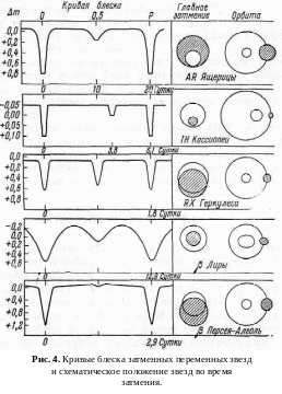 По характеру кривой блеска затменной переменной звезды можно найти элементы орбиты одной звезды относительно другой, относительные размеры компонентов, а в некоторых случаях даже получить представление об их форме. На рис. 4 показаны кривые блеска некоторых затменных переменных звезд вместе с полученными на их основании схемами движения компонентов. На всех кривых заметны два минимума: глубокий (главный, соответствующий затмению главной звезды спутником), и слабый (вторичный), возникающий, когда главная звезда затмевает спутник.