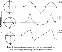 Для определения элементов орбиты какой-либо спектрально-двойной звезды необходимо иметь достаточно большое количество спектрограмм этой звезды, дающих возможность построить так называемую кривую лучевых скоростей. При построении этой кривой по оси абсцисс откладывается время, а по оси ординат – лучевые скорости. Форма кривой лучевых скоростей зависит только от двух элементов – эксцентриситета е и угла , определяющего положение периастра. Характерные образцы кривых лучевых скоростей для некоторых частных значений е и изображены на рисунке 3. Положение горизонтальной прямой у всех кривых этого рисунка соответствует лучевой скорости, которую компоненты имеют при своем движении под прямым углом к лучу зрения (т.е., иными словами, лучевой скорости центра масс системы).