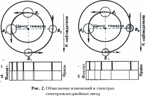Характер и причина изменения спектров спектрально-двойных звезд объясняются рис. 2. Если очень близкие компоненты двойной звезды, движущиеся вокруг общего центра масс, мало отличаются друг от друга по спектру и по блес