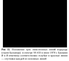 Это особенно четко видно в линиях атома водорода (серии Бальмера) – самых сильных из всех эмиссионных линий SS 433 – см. рис. 11. На рисунке дополнительные линии, лежащие слева от основной, т е. в сторону голубого края спектра, отмечены буквой В от слова blue – голубой; будем называть их голубыми линиями-спутниками. Дополнительные линии, лежащие справа от основной, т. е. в сторону красного края спектра, отмечены буквой R – от слова red – красный, будем называть их красными линиями-спутниками. Можно заметить, что линии-спутники расположены относительно основных в строгом порядке. Именно на шкале длин волн каждая голубая линия-спутник отстоит от основной на отрезок, который пропорционален длине волны основной линии: