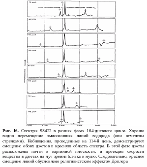 Ни в Галактике, ни вне ее никогда не наблюдалось прежде источника, который излучал бы сразу две системы линий, столь сильно сдвинутых от стандартных положений. Большие смещения в красную сторону спектра встречаются у квазаров, самых далеких объектов Вселенной. Во всех же известных до сих пор случаях смещения в голубую сторону абсолютное значение z меньше, по крайней мере, в 20-100 раз, чем у SS 433.