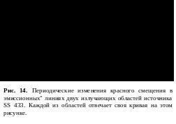о самое удивительное было обнаружено в наблюдениях осени 1978 – весны 1979 гг. Американский астроном Б. Маргон и его сотрудники, наблюдая SS 433 в сентябре 1978 г., нашли эмиссионные линии-спутники на иных местах, чем за два месяца до того: они разъехались в разные стороны. Значения |zB| и zR возросли и продолжали затем возрастать до ноября 1978 г., пока не достигли максимальных значений |zB|max=0,l; (zR)mах=0,18. Затем началось уменьшение |zB| и zR, и в течение декабря, пока продолжались наблюдения, линии-спутники приближались к основным линиям спектра. Когда в марте 1979 г. наблюдения были продолжены (с декабря до февраля источник не виден), оказалось, что линии-спутники снова удаляются от основных линий; в конце апреля был достигнут новый максимум, причем |zB| и zR вновь приняли те же значения, что при первом максимуме.