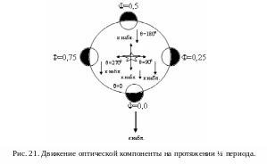 Понимая смещение линий в спектре источника как следствие движения двух излучающих областей, каждой из которых отвечает своя кривая на рис. 14, мы должны теперь считать, что это движение имеет периодический характер. Каждая из излучающих областей то приближается к нам, то удаляется от нас, и когда одна приближается, другая удаляется, и наоборот. Дважды за период области меняются местами: та, что приближалась, начинает удаляться, а та что удалялась, начинает приближаться. В эти моменты (b и d на рис. 14) лучевые скорости излучающих областей должны, очевидно, обращаться в нуль.