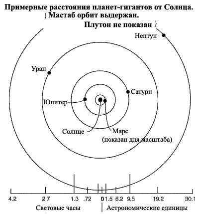 Юпитер, Сатурн, Уран, и Нептун известны как планеты-гиганты (подобные Юпитеру планеты), потому что они имеют гигантские размеры по сравнению с Землей, а также имеют газообразную природу, подобно Юпитеру.Следующая диаграмма показывает приблизительное расстояние планет-гигантов от Солнца.