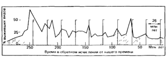 Откладывая на геологической шкале времени эпизоды массового вымирания (по горизонтальной шкале — время в миллионах лет в обратном исчислении от нашей эпохи, по вертикальной — процент выживших видов), палеонтологи обнаружили между ними регулярные интервалы в 26 миллионов лет (рис. 5). Очевидно, что такие вымирания земных живых организмов — процессы сложные и зависящие от множества причин: резких изменений климата, оледенений, флуктуации уровня океанов, уменьшений концентрации кислорода в водах морей и океанов, что вызывает кислородное голодание, и наконец, различных внеземных обстоятельств.