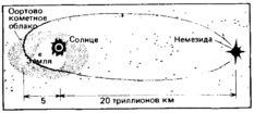 Во Вселенной существует большое количество парных звезд, обращающихся вокруг общего центра. Немезида (но имени древнегреческой богини, каравшей всех возвысившихся за надменность), полагают астрономы, если она действительно существует, должна совершать оборот но своей орбите за 26 миллионов лет. Сейчас она от Солнечной системы далеко, но примерно через 15 миллионов лет должна подойти на достаточно близкое расстояние к Солнцу (рис. 6).