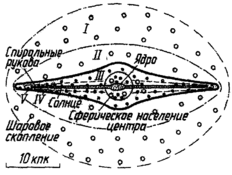 сть прямая связь между результатами Бааде и Кукаркина. Плоские подсистемы состоят из населения I типа, сферические—из населения II типа. Любопытно, что звезды II типа отличаются дефицитом металлов, что скорее всего свидетельствует о большом возрасте звезд сферических подсистем.