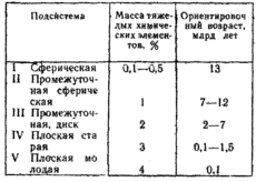 Описанное разделение на подсистемы, по-видимому, имеет глубокий эволюционный смысл, раскрыть который в деталях предстоит в будущем. В настоящее время принято делить население Галактики на пять подсистем, схемы и названия которых указаны на рисунке. В следующей таблице приведен примерный возраст каждой из подсистем в миллиардах лет и их характерный состав.