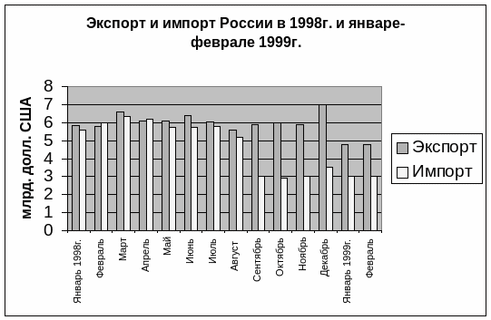 Внешняя торговля играет позитивную роль в экономике, ее значение до последнего времени возрастало. Снижение курса рубля по отношению к ведущим мировым валютам объективно играет на руку российским экспортерам, увеличивая их доходы от внешнеэкономической деятельности. В этих условиях первостепенное значение приобретает расширение присутствия отечественных поставщиков на мировом рынке. Однако под воздействием прежде всего внутренних причин, а так же резко ухудшившихся внешних условий пока складывается обратная ситуация. При этом особое беспокойство вызывает резкое сокращение экспорта товаров в страны дальнего зарубежья. В результате ухудшается участие России в мировой торговле, суживаются возможности пополнения валютных резервов. По данным ГТК России, в 1998г. в годовом исчислении (без учета неорганизованной торговли) экспорт товаров России сократился на 16,7%, в том числе в страны дальнего зарубежья – на 15,7%, тогда как мировой возрос примерно на 7%. Эта негативная тенденция сохранялась в I квартале текущего года: внешнеторговый оборот России в январе – феврале 1999 года составил 15,4 млрд. долларов США и по сравнению с аналогичным периодом прошлого года сократился на 34%. [3].