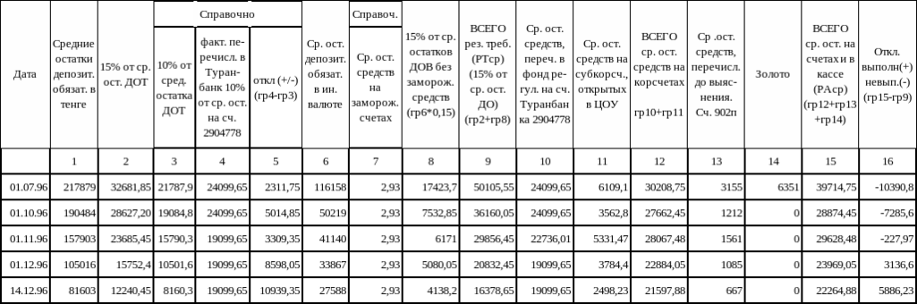 | Дата | Среднемесячные резервные требования (РТср) | Среднемесячные резервные активы (РАср) | Отклонения (РАср - РТср) (выпол.(+)/невыпол(-) |