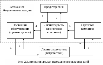 существление лизинговых операций подразумевает участие в них лизингодателя (лизинговой компании), поставщика оборудования, приобретаемого лизингодателем, банка, кредитующего лизингодателя, и лизингополучателя (потребителя). Иногда лизингодатель страхует передаваемое в лизинг оборудование через специализировнную страховую компанию. В отдельных случаях лизингодатель, компания производитель и поставщик оборудования, банк-кредитор и страховая компания объединяются в холдинг (рис. 2.3.)0.