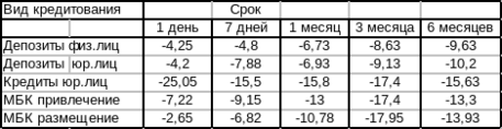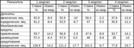 Данные таблицы показывают, что наиболее значительные изменения по процентным ставкам депозитных вкладов и кредитованию юридичеких лиц происходили в 1, 2 и 4 кварталах, по процентным ставкам МБК – в 1, 3 и 4 кварталах, можно предположить, что изменениетемпов развития на рынке ссудных капиталов происходит с периодичностью в три квартала и что эти изменнения по процентным ставкам МБК происходят на квартал раньше.