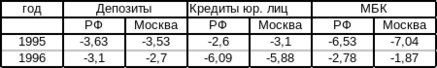 В таблице 1 отражено, как происходило изменение процентных ставок рынка ссудного капитала в 1995 г. и в 1996 г. в целом по РФ и по московскому региону . Анализ показателей, приведенных в таблице, позволяет сделать следующие выводы: во-первых, скорость падения процентных ставок в 1996 г. выросла только по кредитованию юридических лиц, причем в Москве по сравнению с остальными регионами РФ, она была несколько меньше. Во-вторых, происходило изменение прироста по процентным ставкам депозитов и МБК как по соотношению приростов в 1995 и в 1996 гг., так и в соотношении между Московской и РФ в целом.