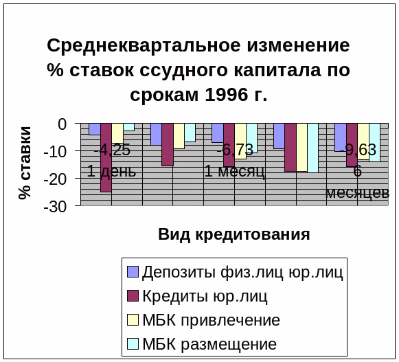 Как мы видим, меньше всего ставки понизились по однодневным операциям. Исключение составляют лишь кредиты юридических лиц, которых в общей совокупности операций по кредитованию юридических лиц крайне мало, всего около 1 %. Далее следуют ставки по семидневным операциям, затем одномесячные и трехмесячные операции, то есть с ростом срока операции в 1996 г. происходило и увеличение темпа подения процентной ставки. Исключение составили по некоторым видам операций шестимесячные ставки, но по привлечению и размещению МБК таких операций бало очень мало.