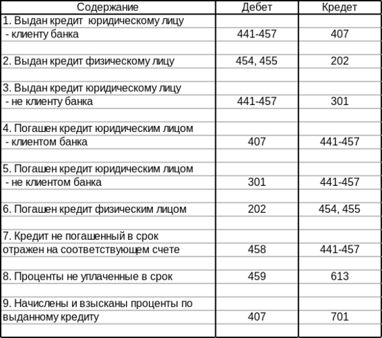 суммы предоставленых кредитов в корреспонденции с расчетным (текущим) счетами клиентов, счетом кассы ( для физических лиц ), корреспонденскими счетами;