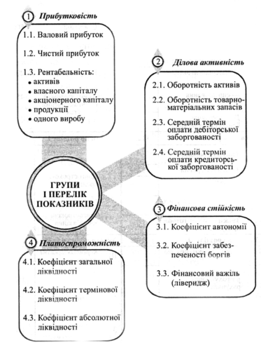 Оцінка фінансового стану підприємства на фіксовану дату здійснюється на підставі аналізу офіційних документів — звітів про: фінансові результати, рух грошових коштів, власний капітал і системи розрахункових показників. Загальновживані групи таких показників наведено на рис. 1.