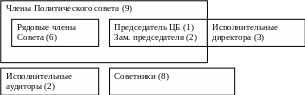 Политический совет состоит из 9 членов. Это 6 назначенных рядовых члена совета, Председатель и 2 его заместителя.