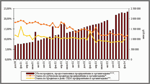 Динамика процентных ставок и объема выданных кредитов в 2000-2004 гг.