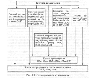 Усі рахунки, що належать до групи рахунків «Кошти в розрахунках», — пасивні, тобто мають кредитове сальдо, і залишки за цими рахунками використовуються як безкоштовні банківські ресурси. Схема рахунків до запитання, що об'єднує поточні рахунки та рахунки коштів у розрахунках, наведена нижче (рис. 4.1).