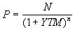 Процесс оценки стоимости бескупонной облигации заключается в определении современной величины элементарного потока платежей, по известным значениям номинала N, процентной ставки r и срока погашения n. Пусть r = YTM. С учетом принятых обозначений, формула текущей стоимости (цены) подобного обязательства примет следующий вид: