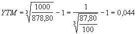 1000 / (1 + 0,044)3 = 878,80.