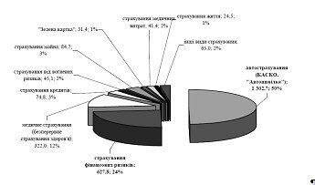 Рис. 4 Структура валових страхових премій у розрізі видів страхування станом на 1 квартал 2010 року (млн.грн,%)