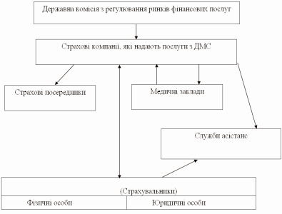 На сьогоднішній день в Україні сформулювалась певна структура ринку ДМС Даний ринок можна розглядати як багаторівневу структуру зі складним механізмом взаємозалежних зв’язків між усіма структурними одиницями (рис. 1)[4].
