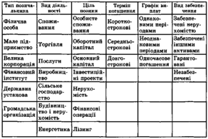 Класифікацію кредитів залежно від категорії позичальника, строку, механізму погашення кредиту, його забезпечення наведено в табл.19.1.