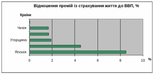 Існує пряма залежність між рівнем ВВП країни та долею зборів по страхуванню життя в ВВП. Український ринок реального страхування життя складає 0,07-0,08% від ВВП. За цим показником Україна багаторазово поступається не тільки країнам з найвищим у світі рівнем добробуту, але і своїм сусідам у Центральній та Східній Європі. Так, за даними 2008 року у Чехії, Угорщині та Польщі ринок страхування життя становив біля 1-2% від ВВП, у США – 4-5%, в Японії – 8-9% (рис.1) [6].