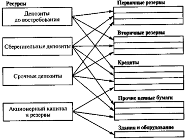 Требования к наличию резервов по депозитам до востребования, как обязательные, так и вытекающие из скорости оборота средств, очевидно, будут значительно выше, чем к наличию резервов по капиталу. Основной капитал, не требующий покрытия резервами, может быть использован на вложения в основные средства и долгосрочные инвестиции. Метод распределения активов представлен на рис. 2.