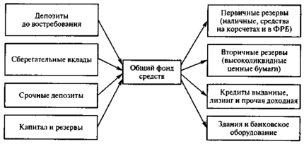 В первую очередь банк формирует резервы — первичные и вторичные. В балансе эти резервы не выделяются отдельными строками. Это ликвидные средства, которые размещены в форме наличных денежных средств, средств на счетах в банках-корреспондентах, в Федеральном резервном банке; в высоколиквидные государственные или муниципальные ценные бумаги, в отдельных случаях — в кредиты (с ближайшим сроком погашения до 30 дней, в кредиты до востребования).