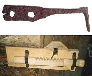 Если исходить из длины зубцов ключа, можно оценить толщину засова и высоту обоймы, в которой располагались задержки. Обойма – все, что осталось от деревянной направляющей, нижняя часть которой исчезла, так как мешала ключу. Следовательно, засов должен был перемещаться в боковых направляющих, расположенных по бокам обоймы.
