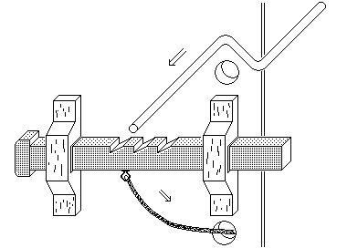 Среди замков-засовов следует отметить замок, изображенный на рис.8. Зауженная замочная скважина в нем была расположена над выступающими зубцами засова, а ключ производил колебательные движения. Ключом и запирали и отпирали замок. Но для операций с таким замком использовать S-образный ключ с параллельными плечами не удобно – изгиб рукоятки ключа не удобен для приложения больших усилий (косточки пальцев будут тереться о дверь).