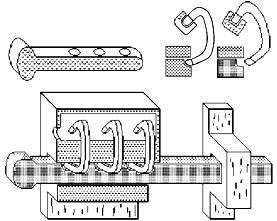 В таком замке (см. рис.3) засов блокировался С-образными колодками, с головками в форме желудя, которые размещали в пазах внутри направляющей. Колодки отводились в сторону ключом, чем разблокировали засов. Важно, что ключ совершал вращательное движение. Количество колодок, их размер и шаг между ними определяли секретность замка.