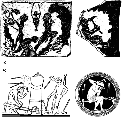 Рис.1. Изображения на греческой керамике: а) рудокопов; б) кузнецов