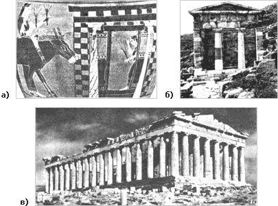 Рис.4. Постройки Греции: а) изображения дома на греческой вазе; б) сокровищница афинян в Дельфах; в) Парфенон в Афинах