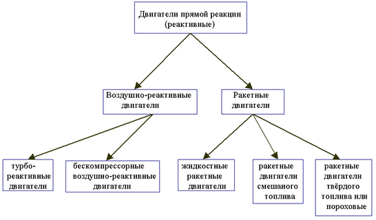 В основе современных мощных реактивных двигателях различных типов лежит принцип прямой реакции, т.е. принцип создания движущей силы (или тяги) в виде реакции (отдачи) струи вытекающего из двигателя "рабочего вещества", обычно - раскалённых газов.
