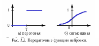 В 1960 г. на основе таких нейронов Розенблатт построил первый в мире автомат для распознавания изображений букв, который был назван “перcептрон” (perception — восприятие). Этот автомат имел очень простую однослойную структуру и мог решать только относительно простые (линейные) задачи. С тех пор были изучены и более сложные системы из нейронов, использующие в качестве передаточных сложные непрерывные функции. Одна из наиболее часто используемых передаточных функций называется сигмоидной (или логистической) (рис. 2б) и задается формулой